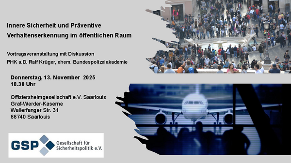 Die Veranstaltung bietet einen praxisorientierten Einblick in die Präventive Verhaltenserkennung, um sicherer in der Bewertung von Situationen im öffentlichen Raum zu werden und das eigene subjektive Sicherheitsgefühl positiv zu verändern. Sie findet in Kooperation mit der Gesellschaft für Sicherheitspolitik (GSP), dem Verband der Reservisten der Bundeswehr e.V. Landesgruppe Saarland und der Deutschen Atlantischen Gesellschaft e.V. (DAG) statt. Wir würden uns sehr freuen, wenn das Thema auf Ihr Interesse stieße und wir Sie begrüßen dürften.