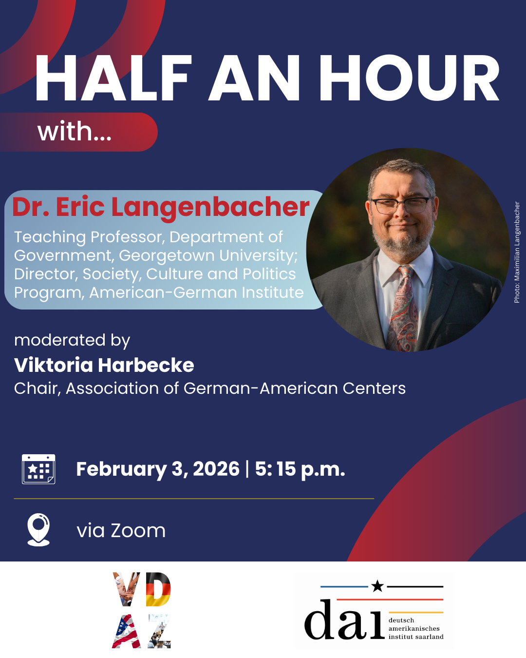 Half an Hour with... ist ein neues transatlantisches Gesprächsformat des Verbunds Deutsch-Amerikanischer Zentren, dessen Mitglied das Deutsch-Amerikanische Institut (DAI) Saarland ist. Einmal im Monat laden wir gemeinsam zu einem halbstündigen Gespräch mit spannenden Persönlichkeiten ein, die fundiert und kompakt über die USA und die deutsch-amerikanischen Beziehungen sprechen. Ob aktuelle politische Entwicklungen, gesellschaftliche Trends, wirtschaftliche Perspektiven oder kulturelle Einblicke: Half an Hour with... bringt transatlantische Themen direkt zu Ihnen nach Hause oder ins Büro. Nutzen Sie die Gelegenheit, unterschiedliche Sichtweisen zu entdecken und Ihre Fragen in den Dialog einzubringen.